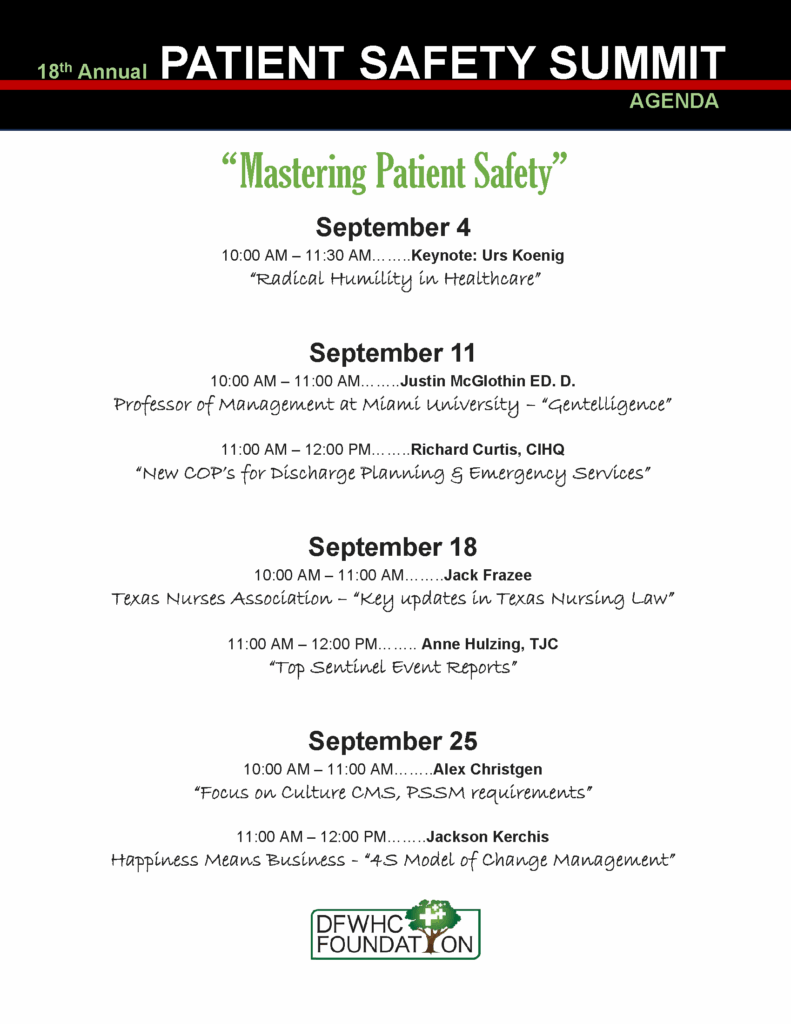 The 18th Annual Patient Safety Summit is designed to educate healthcare providers to include bedside care givers, quality directors, regulatory staff and risk management staff on best practices in patient safety and compliance.