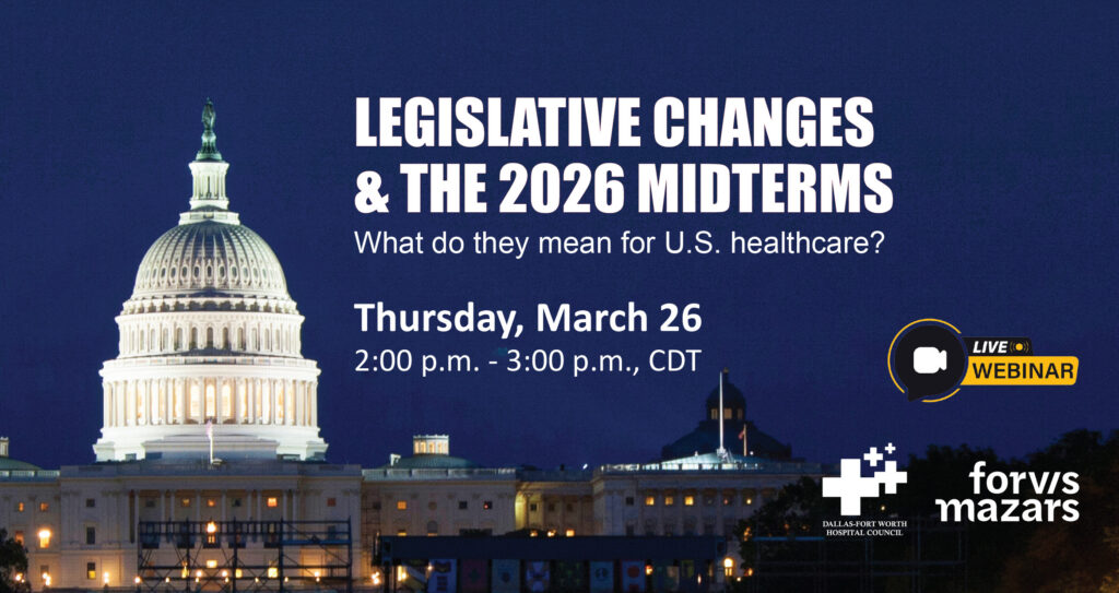 The DFW Hospital Council (DFWHC) and Forvis Mazars will co-host the webinar “Legislative Changes and the 2026 Midterms: What Do They Mean for U.S. Healthcare?” on Thursday, March 26 from 2:00 p.m. – 3:00 p.m., CDT.
