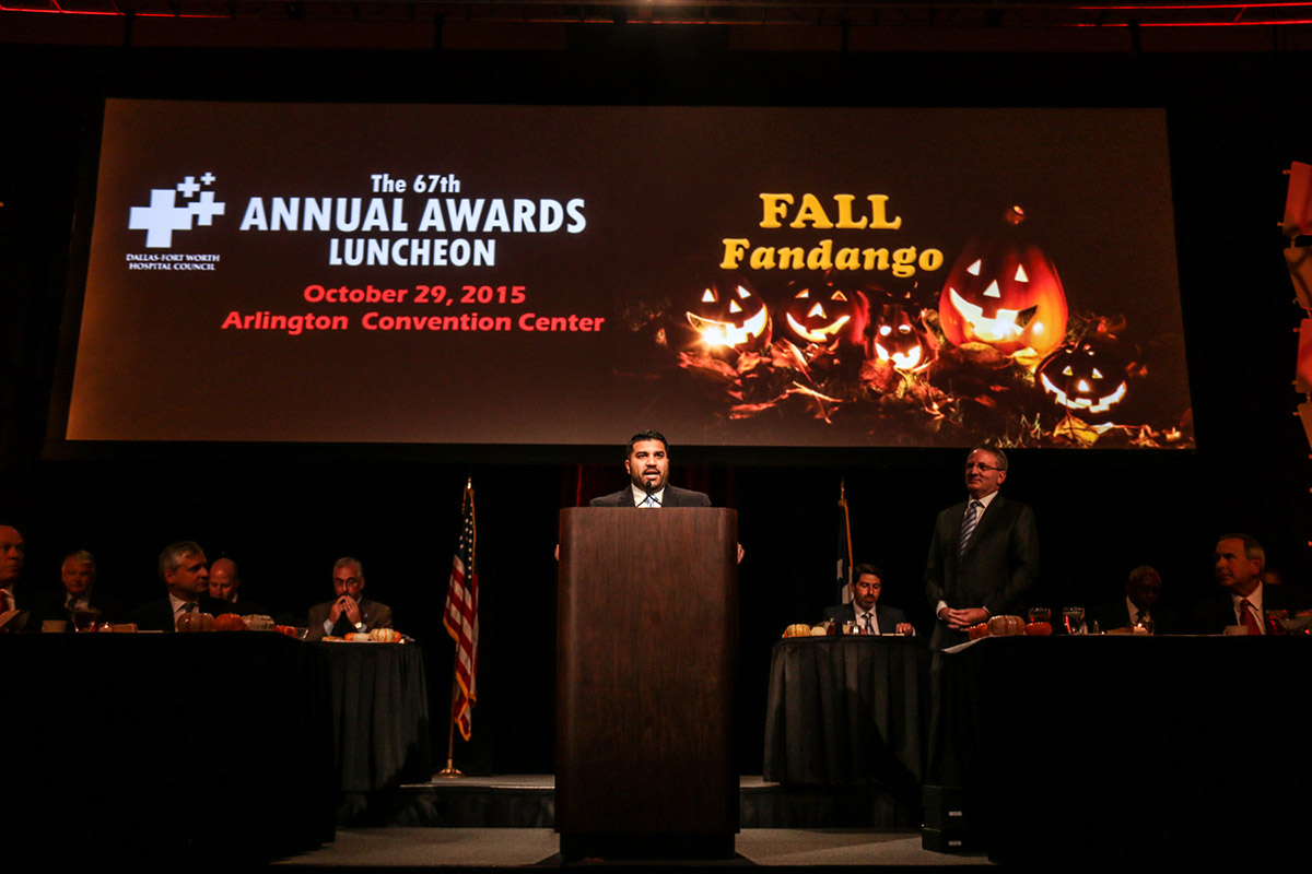 The DFW Hospital Council would like to thank all sponsors and attendees who participated in yesterday’s 67th Annual Awards Luncheon at the Arlington Convention Center. More than 50 chairs of member hospital boards were honored on stage. Dr. Merlyn Sayers was presented the Distinguished Health Service Award. James Mendez of Kindred Hospital Dallas was the recipient of the Young Healthcare Executive of the Year Award. David Biegler of Children’s Health System received the Kerney Laday, Sr. Trustee of the Year Award. Additional highlights included Keynote Speaker Jon Meacham, Jason Castro singing the National Anthem and a surprise appearance by the S.B. & C. dancers performing in honor of the luncheon’s theme, “Fall Fandango.” (photos by Jerry McClure)