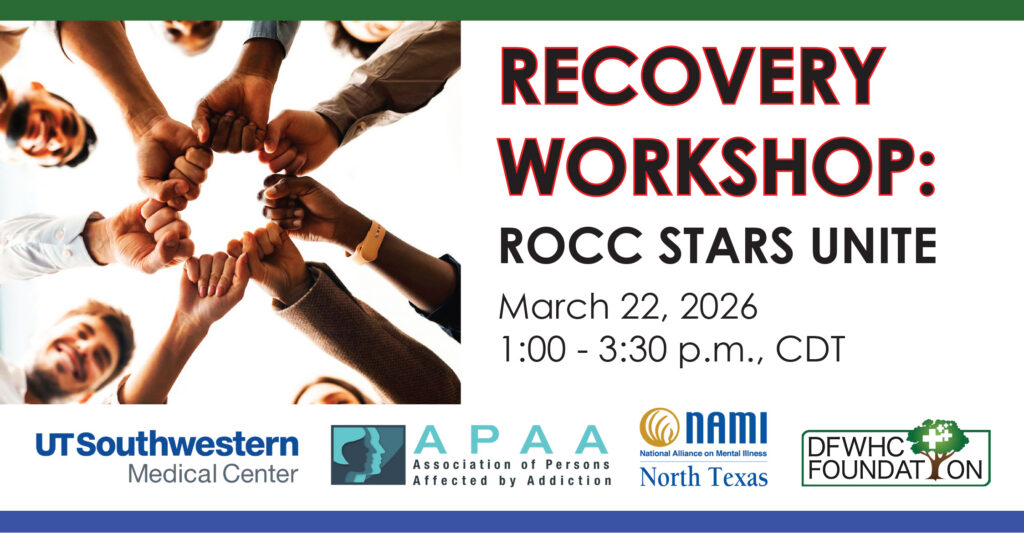 Are you concerned for loved ones or your community and have a passion to help others? If so, learn how to become part of the solution! The DFW Hospital Council (DFWHC) Foundation’s Community Health Collaborative (CHC) will host an in-person “Recovery Workshop: ROCC Stars Unite” on Sunday, March 22 at the PLAN Center in Addison from 1:00 to 3:30 p.m., CDT.