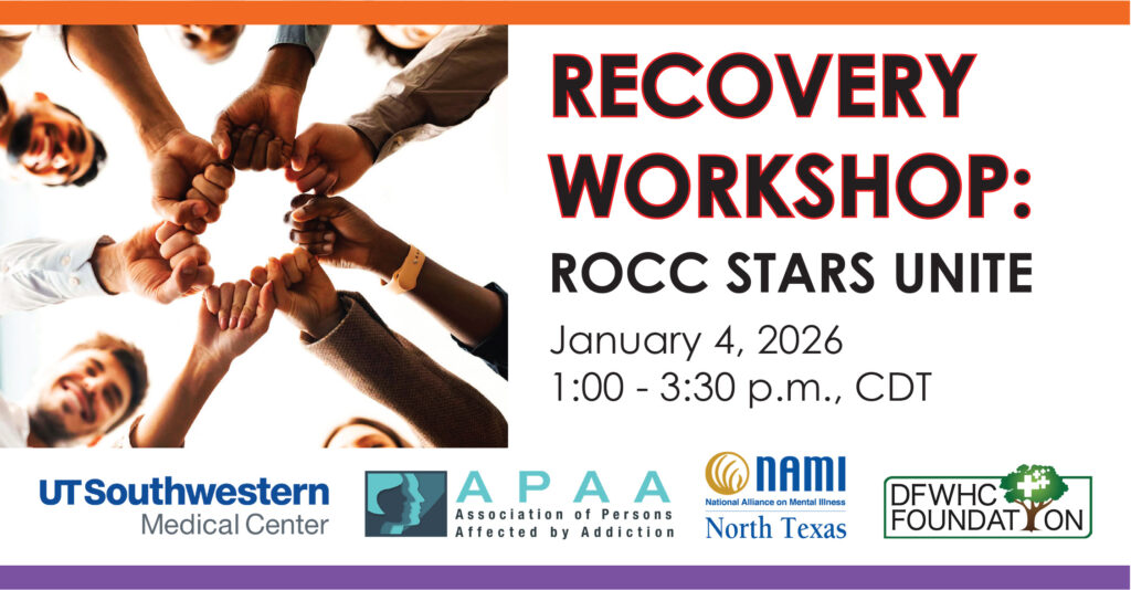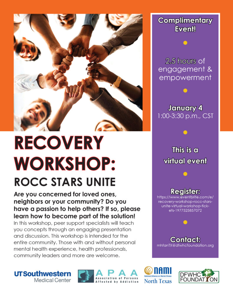 Are you concerned for loved ones or your community and have a passion to help others? If so, learn how to become part of the solution! The DFW Hospital Council (DFWHC) Foundation’s Community Health Collaborative (CHC) will host a virtual “Recovery Workshop: ROCC Stars Unite” on Sunday, January 4 from 1:00 to 3:30 p.m., CDT.